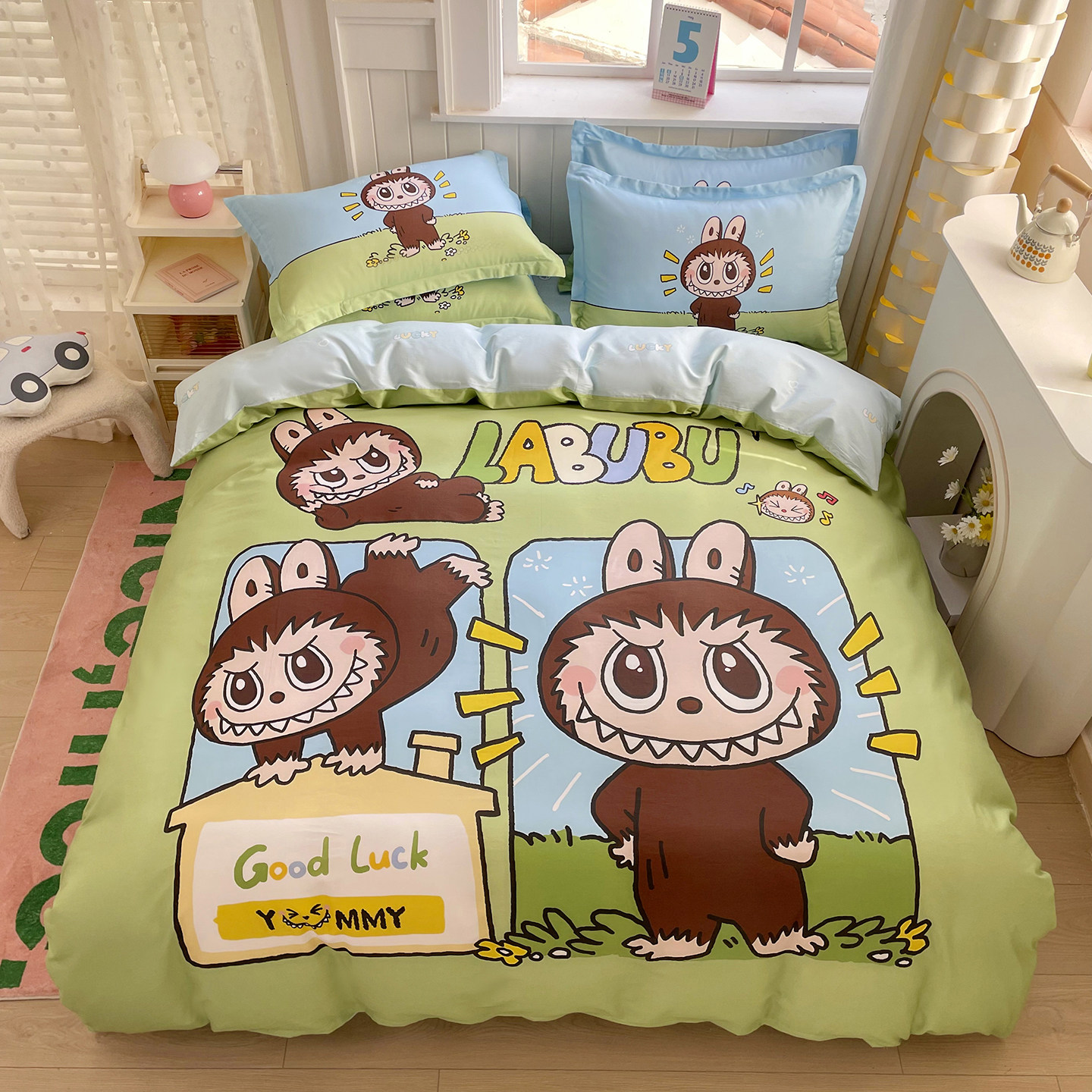 100% قطن نقي مطبوع، طقم من أربع قطع مع لحاف مبطن، مناسب لكل الفصول، ناعم ومريح، لطيف على البشرة وقابل للغسل في الغسالة مباشرة.
